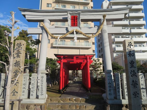 寳ノ海神社は、「神戸市漁業協同組合」が漁業の安全と豊漁を祈願して建てられた神社です。ご祭神は金毘羅大権現、恵美須大神、大黒天大神です。海神社のとても大きな赤い鳥居と並ぶように白い鳥居があり、その奥に数多くの赤い鳥居と小さな祠があります。