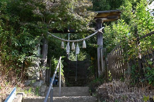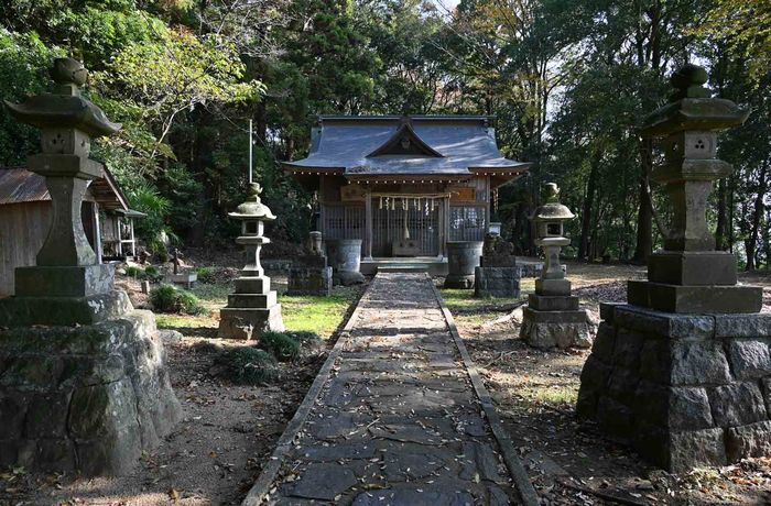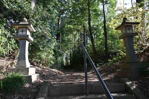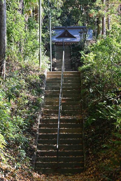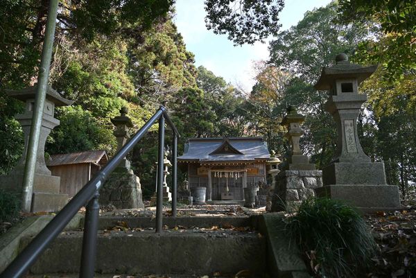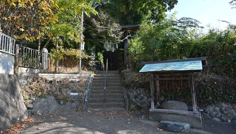 県道157号線が国道349号線と交差する磯部町東交差点から157号線を225m進むと道路左側が神社入口です。元は山上に峰山館(城)がありその上に建立された神社で、太田町と磯部の四人の石工が関わった狛犬さんが鎮座する神社です。
