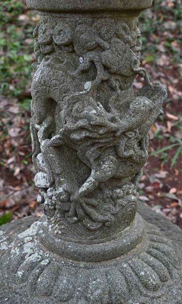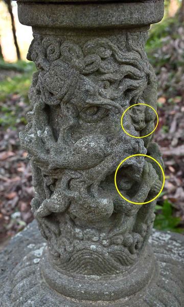 下部に彫刻を彫った風変わりな石灯篭。何が何だか分からない彫刻。龍にも見える。 顔と腕らしき物が彫られている。