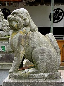 この年代の狛犬としては形態が古い感じがします。もしかしたら、先代を模した物かもしれません。恰幅の良い滑らかですっきりした作りの狛犬ですが、台座から落ちたことがあるのでしょうか?顎や脚に欠損があるのが惜しいですね。