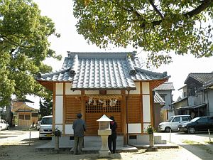 この神社はJR土讃線・善通寺駅の西約350m、24号線に面して鎮座しています。境内は三角形に奥に行くほど広くなり、境内左のゲートボール場ではお年寄りが競技を楽しんでおられました。境内正面には拝殿・本殿が建ち、その右手に祗園神社、本殿奥に土居荒神が祀られています。周囲には樹木が茂る広くゆったりとした神社は、地域の方々に親しまれているらしく、その他散策で立ち寄られた方、参拝を終わって協議中の方達と親しげに会話をされる方等々、三々五々訪れる方達がおられました。