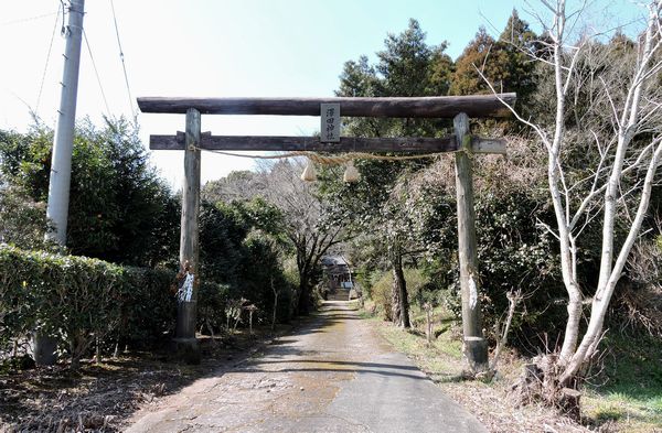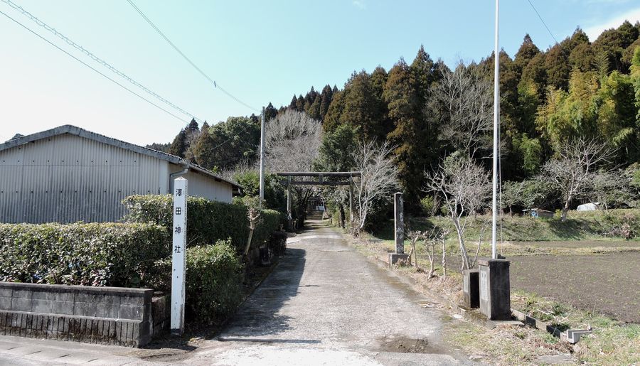 澤田神社は下財部澤田に鎮座する。古くは澤田大明神ともいう。創建年は定かではないが、宇佐八幡宮から勧請したともいう。三国名勝図会には祭神詳ならずとあるが、現在の祭神は帯中日子命(仲哀天皇)、息長帯比売命(神功皇后)、天手力男命である。神紋は菊紋である。往昔は大社であり、流鏑馬や鈎引も実施されていたと伝わる。