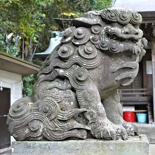 この神社は真鶴道路から岩漁港に向かって降りていき、学校前と岩海岸バス停の中央辺りから海と反対側の込み入った細い道路にはいると鎮座しているのですが、地図にも記載が無く、分かりづらい場所なので私達は散々迷いました。幸いバス通りに町内の案内板がたっており、そこにこの神社も載っていますからそこで確認されるか、お近くの方にお聞きした方がいいと思います。地図にも記載されていない神社なのに、広い社地を持つ落ち着いた佇まいの気持ちの良い神社でした。又、わざわざ栃木県から彫刻師を呼んで造らせた陶器製の狛犬や、流石海辺の神社です、境内社に龍宮神がありました。