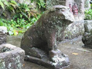 | 階段途中右側、淡島大明神前のはじめ狛犬。 この子達は結構有名で、どんな子達かしらと期待していったのですが、 初めは、余りの小ささにビックリ!! 28センチという超小型で、 背中に万治?元年(1658?)という文字が彫られています。 阿吽の位置が反対で、顔も耳も鬣も尾もほとんど線書きに近く、 前脚お腹の下に刳りぬきは無く、吽の左前脚が欠損しています。 |