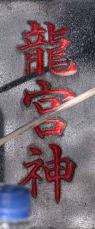 龍宮神鳥居・社号碑、以前は黒地に赤の文字でしたが、シルバーに赤の文字に変わってます。
