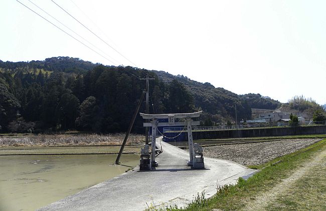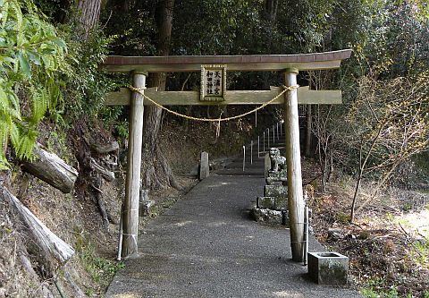 この神社は伊野浄水苑東の高台に鎮座しています。一の台輪鳥居は仁淀川支流の土手近くに立ち、ここから参道は南に約200m程延びています。伊野浄水苑を回り込むように進むと、注連柱が立ち、更に進むと大きな森の入口に二の鳥居が立っています。鳥居の後は石段の参道が続き、その後坂道を登って境内に行き着きます。その間、参道途中と境内入口に土佐型の良い狛犬がいました。