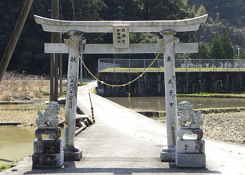 やや切り開かれた境内に、千鳥破風付き入母屋造りの拝殿と、流造の本殿が建立されていますが、鳥居にも拝殿にも「和田神社 天満宮」の二社名が記されています。
