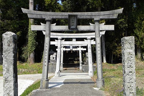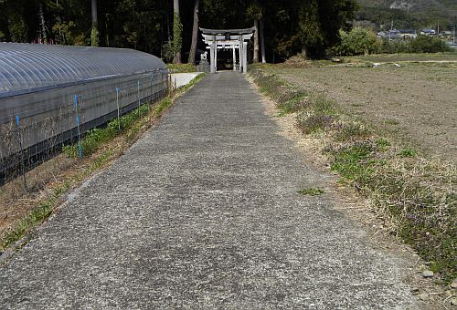 この神社は香長小学校と県道254号線を挟んで東側に鎮座しています。周囲は長閑な田園地帯で、参道入口二は鳥居と明治39年生まれの狛犬が置かれています。始め東に向かっている参道は100m程で折れ曲がって北向きに変わり、二・三・四と三基の鳥居を潜ると大きな鎮守の杜を形成している境内に行き着きます。