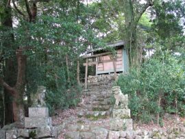 この神社は国道55号線・佐喜浜信号から368号線に入り、唐ノ谷川を渡って約1km程山側に進むと左手奥に鎮座しています。石垣が組まれた中央に階段が作られ、木々に囲まれた境内には上ノ神社社殿と境内社・金比羅宮社殿が建てられています。