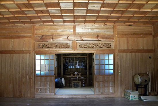 この神社は宿毛市街地から321号線で南下し、伊与野で46号線に入り330m程で左折。伊与野川を渡ると北西方向に大きな森が見えるのが、この社の鎮守の杜です。その杜の中央辺りに鳥居が建立され、昭和15年生まれの狛犬がいます。石段を上がると境内で、明るく伸びやかな境内中央奥に、木造部分が朱に彩色された唐破風付き入母屋造りの綺麗な拝殿と、本殿が建立されています。