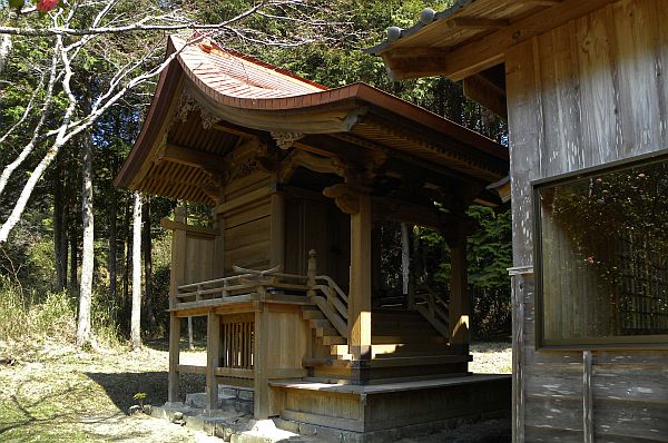 この社はその五社の内、右から二番目に鎮座しています。322号線脇の広場前に「高岡神社 今大神宮」と書かれた額を掲げる鳥居が立ち、一般道と共通の参道を行くと、石段が有り、境内に拝殿、本殿が建立され、拝殿には「御祭神 磯城細姫尊」と書かれた木札が張られていました。