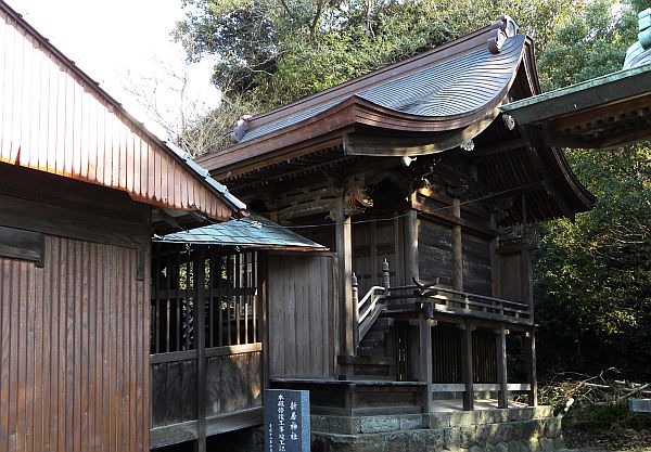 この神社は新居小学校の南約420mに鎮座しています。私達は裏参道入口とも言うべき282号線沿いの西参道入口から境内に入ってしまいましたが、表参道は社地の北東に付けられているようです。