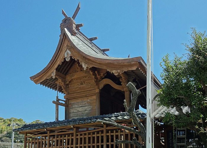 拝殿正面の南側には入口は無く、北西側に鳥居が建立された入り口があり、坂を上がって境内に入ります。入口から見ると、社殿は横向きに建立され、右側に拝殿と繋がって「加茂公民館」が建てられています。その奥に境内社が祀られ、薬師如来堂も建立されています。