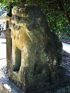 | 石段を上がった左に立つ燈籠上に居るアクロバチックな狛犬 |
