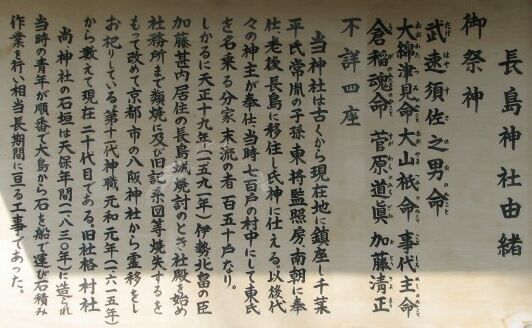 紀伊長島駅から5分程。長島トンネルを抜けた直後で左折すると左手に見えてきます。御祭神の中に加藤清正の名が見えます。どういう経緯でここに祀られているのでしょうか。