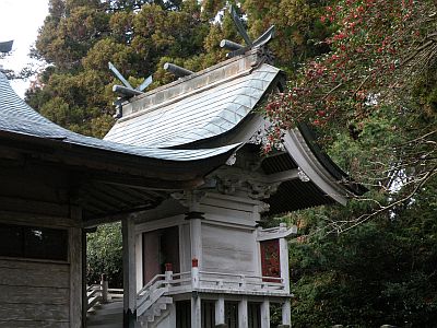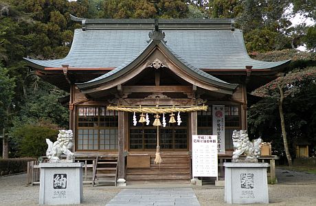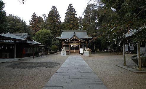 この神社は307号線に一の鳥居が建つ入口があり、そこから南に約150mほどで西に参道が曲がると社頭が見えます。境内入口の二の鳥居の社額は珍しく五角形をしています。境内の周囲は生け垣や木々で囲まれ、中央部分は明るく晴々とした感じがし、参道正面に拝殿、奥に一間社流造の本殿が建っています。