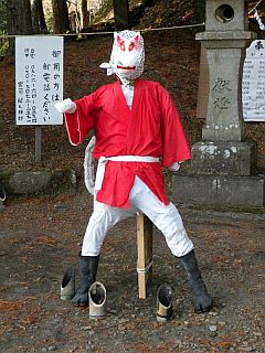 | 境内入口に立つ「微酔い気分の叔父さん」の様な案山子 |