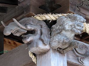 入口には立派な社号標と鳥居が建ち、綺麗に手入れされた参道を歩くと片側だけに透かし塀が付く神門があり、参道正面に千鳥破風と唐破風付き入母屋造りの立派な拝殿、流造りの本殿が建立されています。向拝彫刻の龍や木鼻の狛犬や象も素晴らしい出来です。