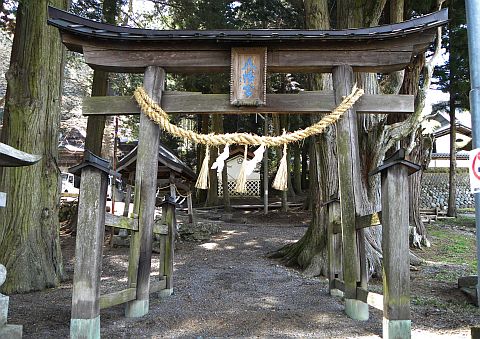 この神社は沢川の南、長松寺に隣接して鎮座しています。遠くから黒々とした大きな鎮守の杜が見え、二股の分かれ道に入口が造られています。神社入り口には重厚な鳥居が立ち、石段参道を上がった上には木製の両部鳥居が建立されています。境内は深閑として如何にも神の坐する所に相応しい雰囲気に満ちあふれ、県天然記念物指定のご神木・ハリギリは極めて数が少なく全国でも2位にランクされている貴重な巨木だそうです。