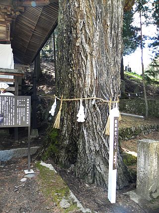 尚、拝殿右脇には御神木と崇められ、推定樹齢310数年を経た巨木が生え、県天然記念物に指定されている。
