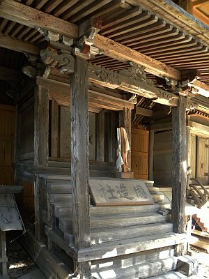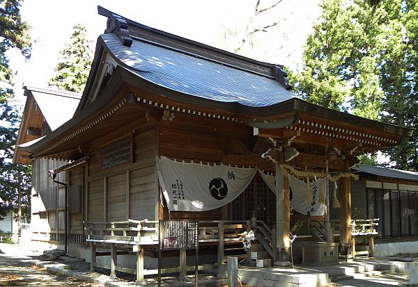 境内を取り囲む様な森の木々の陰で薄暗い境内の中央奥に拝殿、右に社務所、左に境内社が配されています。その拝殿前には昭和10年生まれの松本型の狛犬がいます。町指定有形文化財の本殿は大きな鞘堂内に納められていますが、拝殿正面の扉から正面を拝見することが出来ます。又、そのときは気がつかなかったのですが、本殿縁にも狛犬が置かれていました。