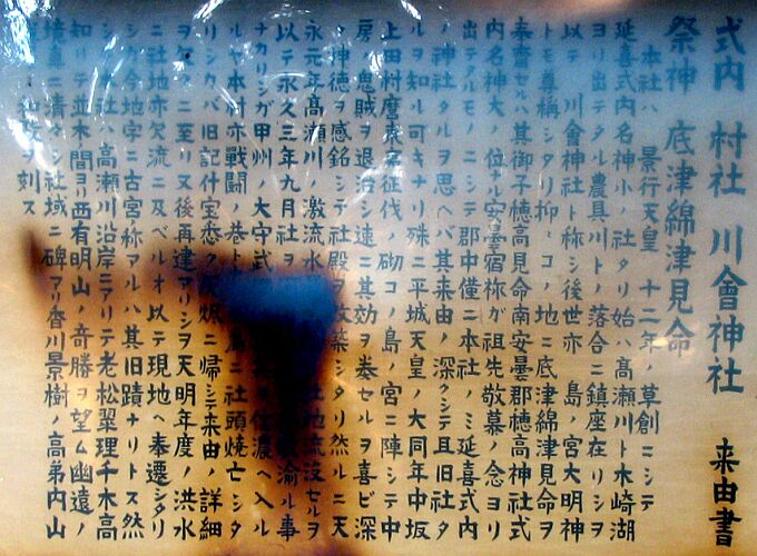 御祭神の底津綿津見命は安曇野市穂高神社の御祭神・穂高見命の父神にあたり、まさに安曇郡内の式内社二社は安曇族の祖神二柱をお祀りしている神社でした。