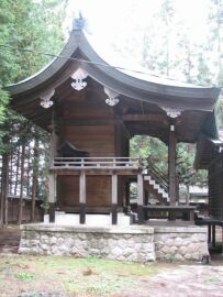 この神社は大糸線・信濃松川駅の西北西約2km、306号線に面して鎮座しています。豊かな鎮守の杜に護られた境内には、中二階や左右に出窓のような部屋のある立派な神楽殿が建ち、奉納相撲が行われるのでしょう、これまた立派な土俵が設えてあります。灯籠や狛犬の奉納された奥には、綺麗な横広の変わった屋根の拝殿が建ち、最奥の塀内の石垣上に流造りの本殿が優雅な姿を見せています。その拝殿内には荒々しい鑿跡をつけたまま白く彩色された木彫神殿狛犬がいて驚かされました。関西には比較的神殿狛犬が多いのですが、ここ長野県では六社目です。