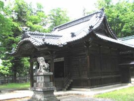 この神社は国道143号線・女鳥羽二丁目と旭一丁目の間の一方通行の道を入り、大安楽寺墓地にて左折すると突き当たりに緑豊かな社叢と大きな鳥居が見えます。岡宮神社の鎮守の杜ですが、ここは松本城築城以前からある古社で、女鳥羽川以北、北深志の総鎮守として重要視されてきました。創建は不詳で、御祭神は健御名方命、伊邪那美命、誉田別命の三柱です。本殿は寛文3年(1663年)松本城主・水野忠職が改築寄進したもので、江戸初期の建築様式を伝えています。新緑の中、広くて荘厳な雰囲気をもつこの神社の境内に佇むと、なお一層神社への尊崇と狛犬に対する愛情が湧き出でてくるような気がしてきました。