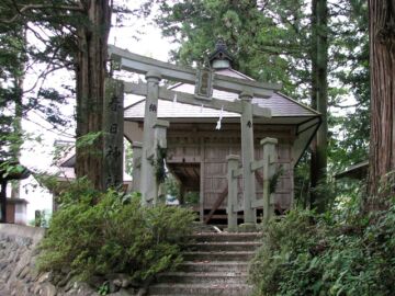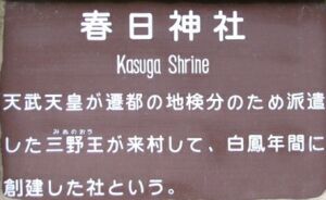 由緒:旧村社、西京集落の産土神で、白鳳時代(645〜710)天武天皇が遷都を計画し、白鳳13年(685)に三野王、小錦下釆女臣筑羅等を信濃に遣わしました。鬼無里に赴いた一行は、裾花川畔に使者館を設けて東京(ひがしきょう)と定め、加茂神社を勧請し、馬繋ぎ場所に三の字を刻んだ大石を置き、対岸を西京(にしきょう)と定め、ここには春日神社を祀りました。さらに鬼門の守護神として日影に猿田彦命を祭神とする白髯神社を鎮座したという伝承が語り継がれています。