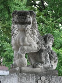 参道で参拝者を睨んでいる狛犬。