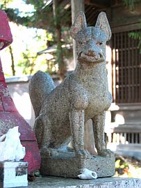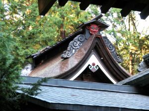 大糸線・北大町駅の西南西約450m、新旧の148号線に挟まれた大町市街地の北部地域に鎮座しています。流石別表神社らしく、遠くからでも県の天然記念物となっているスギ、ヒノキ主体の鎮守の杜が、黒々としたシルエットを見せています。かなり手前の道路上には、大きな一の鳥居が建ち、社号標には「別表神社」の文字が見えます。境内入口の朱の鳥居を潜ると、右手に県宝・三重塔がその優雅な姿を見せ、正面には立派な拝殿と市指定有形文化財・茅葺の観音堂が和様建築の粋を見せてくれています。その奥には重文の桧皮葺春日造本殿が優雅で華麗な佇まいを見せ、妻には赤鬼が、縁には優しい面立ちで逞しい体つきをしている木像神殿狛犬までいました。