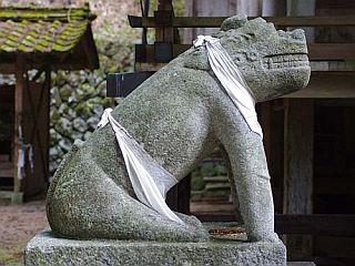 | 本殿前にいる神殿狛犬 (拝殿の扉から覗けるだけですので、左は暗くて撮影に失敗。) |