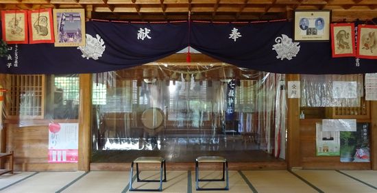 この神社は、福江島東部、玉之浦町荒川の街外れに鎮座しております。荒川地区から384号線を離れ狭い道路を七つ岳に向かって進むと、前方にデコボコした峰が連なる七岳山の威容が見えてきます。周囲の山々とは異なる山容に心躍り、又、平家の落人伝説が生まれ人々に厚く崇敬されてきたその歴史がなんとなく理解できた気がしました。