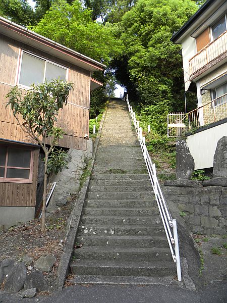 この神社は小ヶ倉の漁港が望める小丘上に鎮座しています。入口の鳥居を潜ると谷桜記念碑と青年会創立碑が建立されており、境内へと続く長い石段が、かなりの急勾配を見せて木々の緑の間に造られています。境内に上がると参道は右にカーブしており、境内右奥に拝殿と石祠の本殿が建立されています。木々の間から小ヶ倉の漁港が見晴らせました。