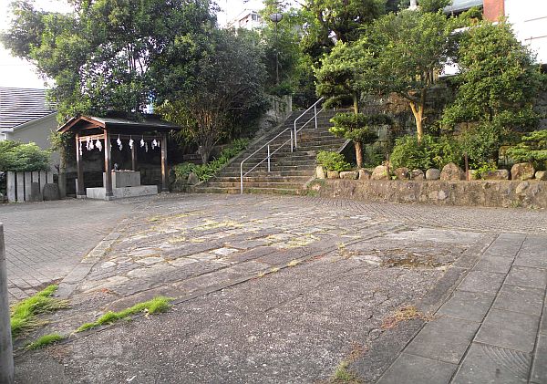 この神社は長崎観光のメッカ・グラバー園や大浦天主堂のすぐ東側に鎮座しています。坂の覆い長崎のご多分に漏れず、神社の社地も高低差の激しい社地に造られています。入口に灯篭と鳥居が建立され、石段を上がっていくと明るく開けた下の境内に行き着きます。と柚社を左に見てなおも石段を上がっていくと、都邑に狛犬が居り、上の境内に上がるとすぐ目の前に拝殿・階段と弊殿、少し離れて石垣の上に流れ造りの本殿が建立されています。