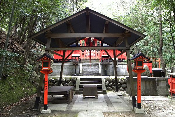 | 本殿を囲む板塀と入口に立つ木製鳥居 |