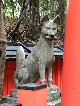 石段を上がりきると朱の板塀に囲まれた境内は横に広く、左側に石碑と先代のお狐様、右側に拝所や本殿が建立されています。本殿の板塀を回り込み裏に回ると、奥の院を思しき社殿が建ち、そこから続く右側へと降りる参道にも沢山の石碑が奉納されています。