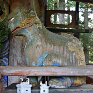 本殿縁側の木造狛犬。拡大写真はこちら。