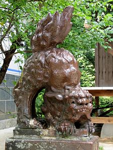 | 境内入口にいる明治29年生まれの構え獅子 頭部が大きい所為でしょうか、成犬というよりも子犬に近い感じの若々しい狛犬です。真っ直ぐに生えそろった平歯が目立ちます。 狛犬の拡大写真はこちらで |