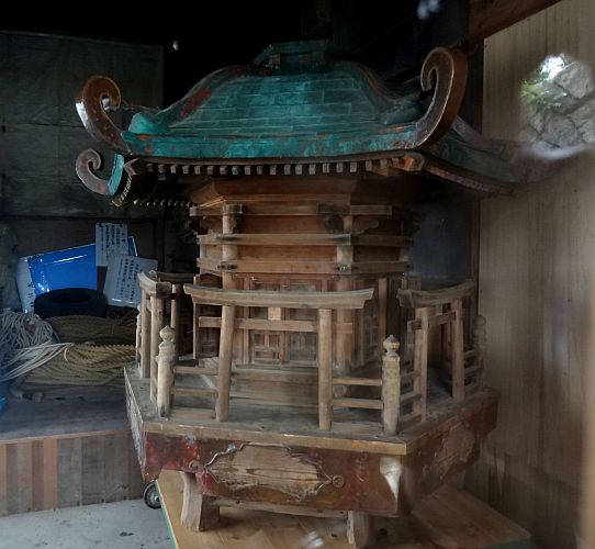 現在、本殿のお稲荷さんには幕がかけられ、拝殿内には町内の「神輿」が2基納め置かれている。拝殿軒先の天井は格天井になっていて、24枚の板にそれぞれ漢字が12枚、和歌が12枚書かれているが消えかかって読めないのが多い。書いた人、由来は不明。また、この社に「大般若経」の経典があったが今は威徳寺に保管されている。
