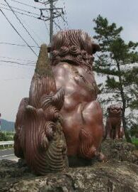 備前焼の大きな狛犬。立派な体格ですがあちこちの補修の痕が痛々しい。
