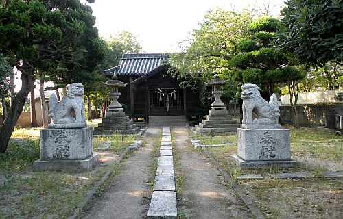 この神社は東岡山駅から南西約1kmに鎮座しています。生け垣の入口を分け入ると鳥居が建ち、石の敷かれた参道奥にブロック塀、そこからが境内となります。境内には嘉永5年生まれの狛犬がおり、正面に拝殿、本殿と続きます。
