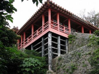 社務所の正面にはトンネルのようなものが見えますが、このトンネルが、社殿までのアーチ橋階段の下の部分にあたるのです。さらに社務所横から石段を登ると石組みが組まれた上に祭場があり、祭場の正面の石段の上には京都の清水の舞台を彷彿とさせる造りの高床式の拝殿が建っています。又、祭場からは対岸の小高い丘の上に首里城が良く見えます。本殿は少し離れた岩盤の上にあり、祭場と社殿の間はアーチ状の石の階段で繋がれています。本殿の間近に行くには祭場から反対側に降り、本殿脇へ続く石段や橋を登ると右側に近づくことが出来、帰りは先ほどのトンネルを潜ると戻れます。