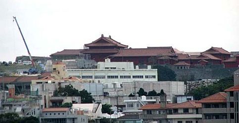 | 祭場からは対岸の小高い丘の上に首里城が良く見えました。 |