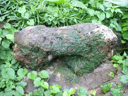 この村落石獅子は329号線・兼城信号東傍のJAや業務スーパー脇の道を入ると、坂の途中に「兼城石獅子」の案内があるので、それに従って行きます。突き当たり左のアパートから尚も右にある歩道を進むと、フェンス後ろの崖上に、教育委員会設置の案内板があり、その下に苔むした石の固まりが見えます。それが石獅子です。