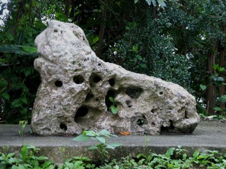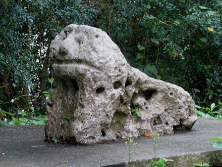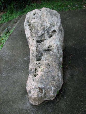 この石獅子は志多伯公民館裏に南東に向けて置かれています。 顔はまだ造形が残っていますが、身体には大小の穴が多数開いており、摩耗も激しく、想像力を働かせないと、あまり獅子には見えません。 永い間志多伯を護り続けてきた石獅子さんです、これからは人間が石獅子を大事にしてあげてほしいですね。
