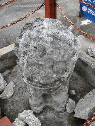 この石獅子は329号線・上与那原信号から77号線に入り、200m程で右折すると、50m位で右側の駐車場に南向きに置かれています。