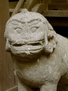 | 本殿覆い屋内にいる狛犬 阿吽共に小さな突起があり、正面の顔つきは、お伽噺に出てくる桃太郎や金太郎のように眉毛をきりっと上げて、若々しく溌剌としています。鬣は短く二段に縦ロール、尾は短めで先が分かれ、お尻に張り付いています。 狛犬の拡大写真はこちらで |