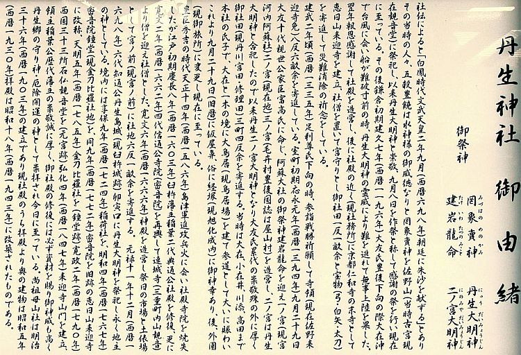 由緒:社伝によると、「白鳳時代文武天皇2年(698)朝廷に朱沙を献ずる。」とあり、水神・罔象賣神を佐野山(当時小宮現在観音堂)に祭祀し、以来丹生大明神と崇敬を受けてきました。その後鎌倉時代初期の建久7年(1196)大友氏が台風により難破寸前の所、丹生大明神の神威により難を逃れたとして社殿を造営しました。