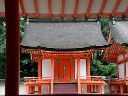 七月末、八月上旬毎年行われる神幸祭に、三日二夜の間御滞在になる御旅所に当る社殿です。昭和の御造営前は、大鳥居の外側にありましたが、昭和御造営に臨み、応永年間の頓宮旧蹟に復されました。昔の造替の時の上宮、下宮、若宮の頓宮は、当時の各社殿に準じ大体同じで、大きな規模であったことが古図に残っています。 |